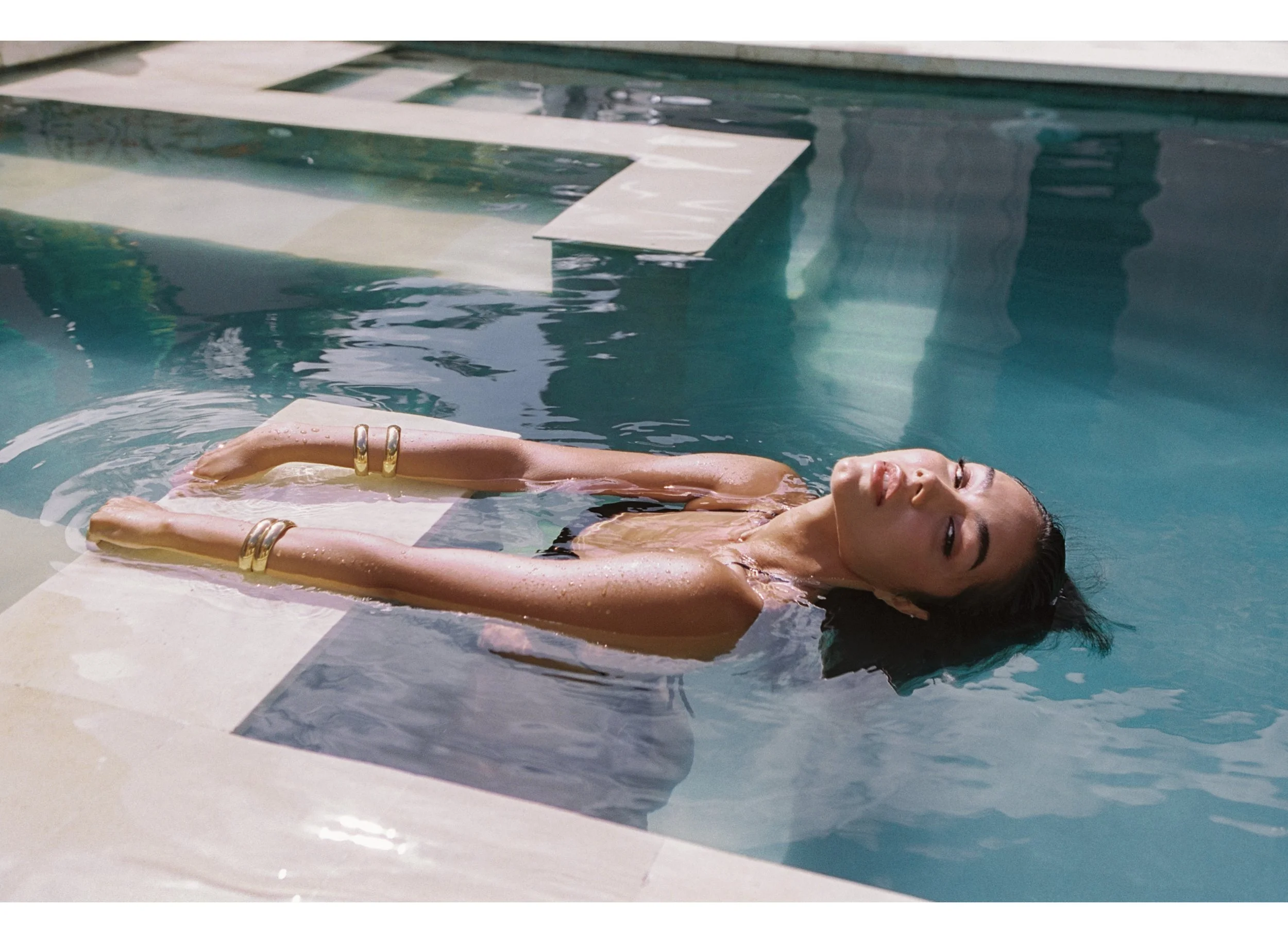 A woman floating on her back in a swimming pool with her eyes closed, wearing gold bangles on her arms and a black swimsuit.