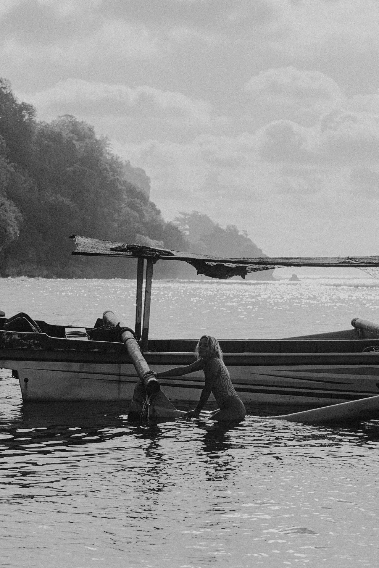 Black and white photo of a woman with sandy hair, wearing a bikini with ring details on the straps, looking at the camera.