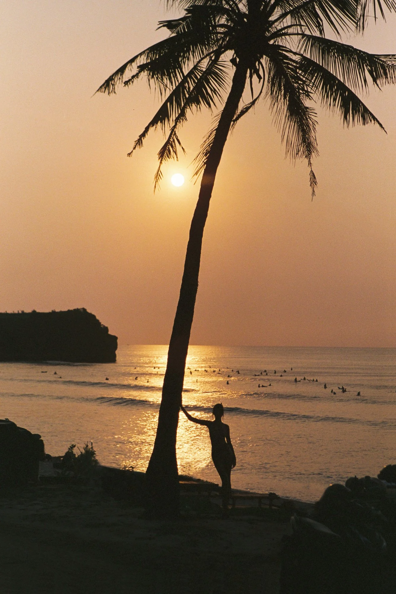Silhouette of a person walking on a beach at sunset with boats and a rocky coastline in the background.