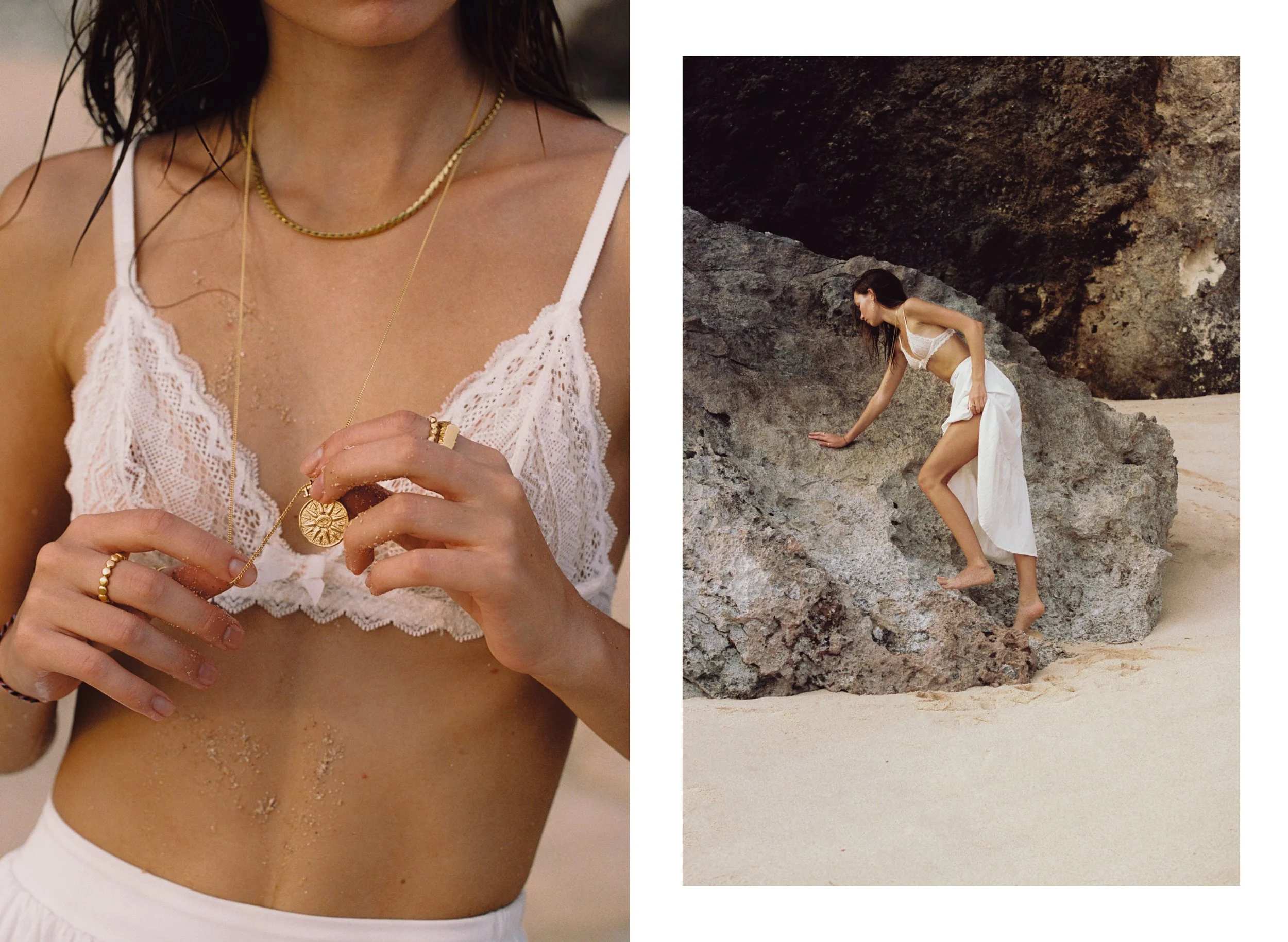 A woman wearing jewelry and a white lace bralette on a sandy beach with rocks in the background.