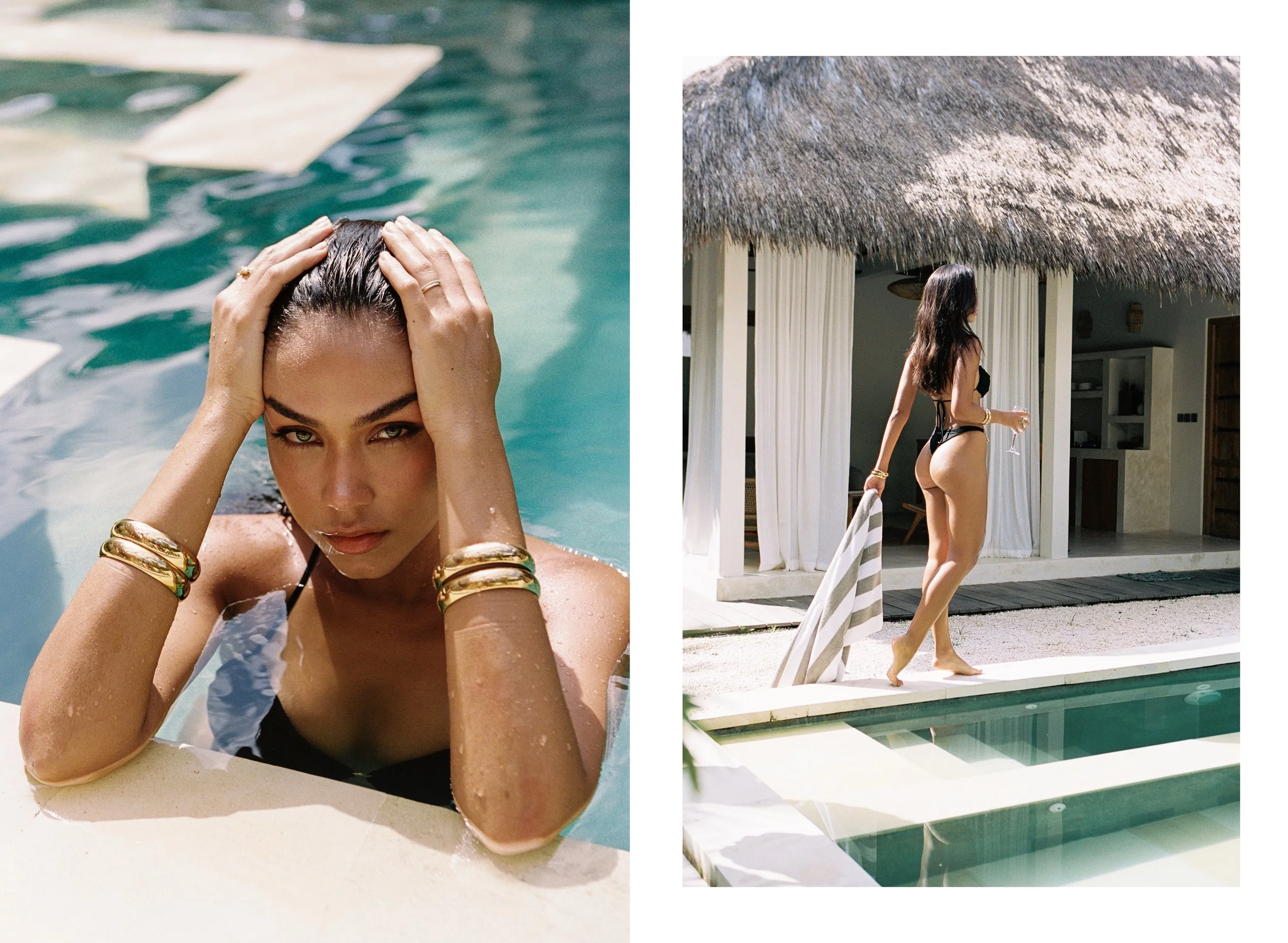 A woman with dark hair and gold jewelry in a pool on the left, and a woman in a black swimsuit walking by a pool near a thatched-roof cabana on the right.
