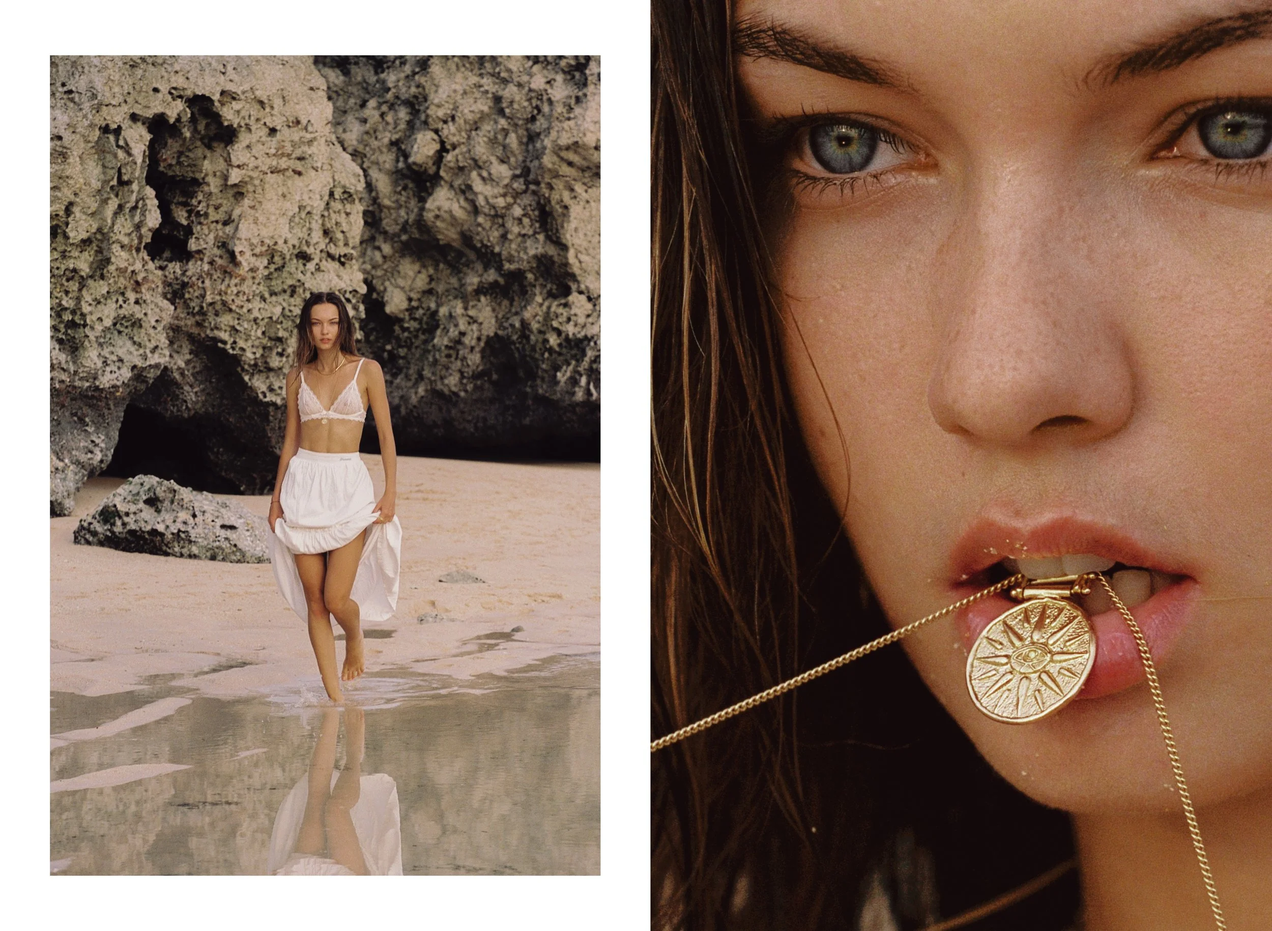 A woman walking on the beach near rocks, wearing a white dress, and a close-up of her face with a gold necklace near her lips.