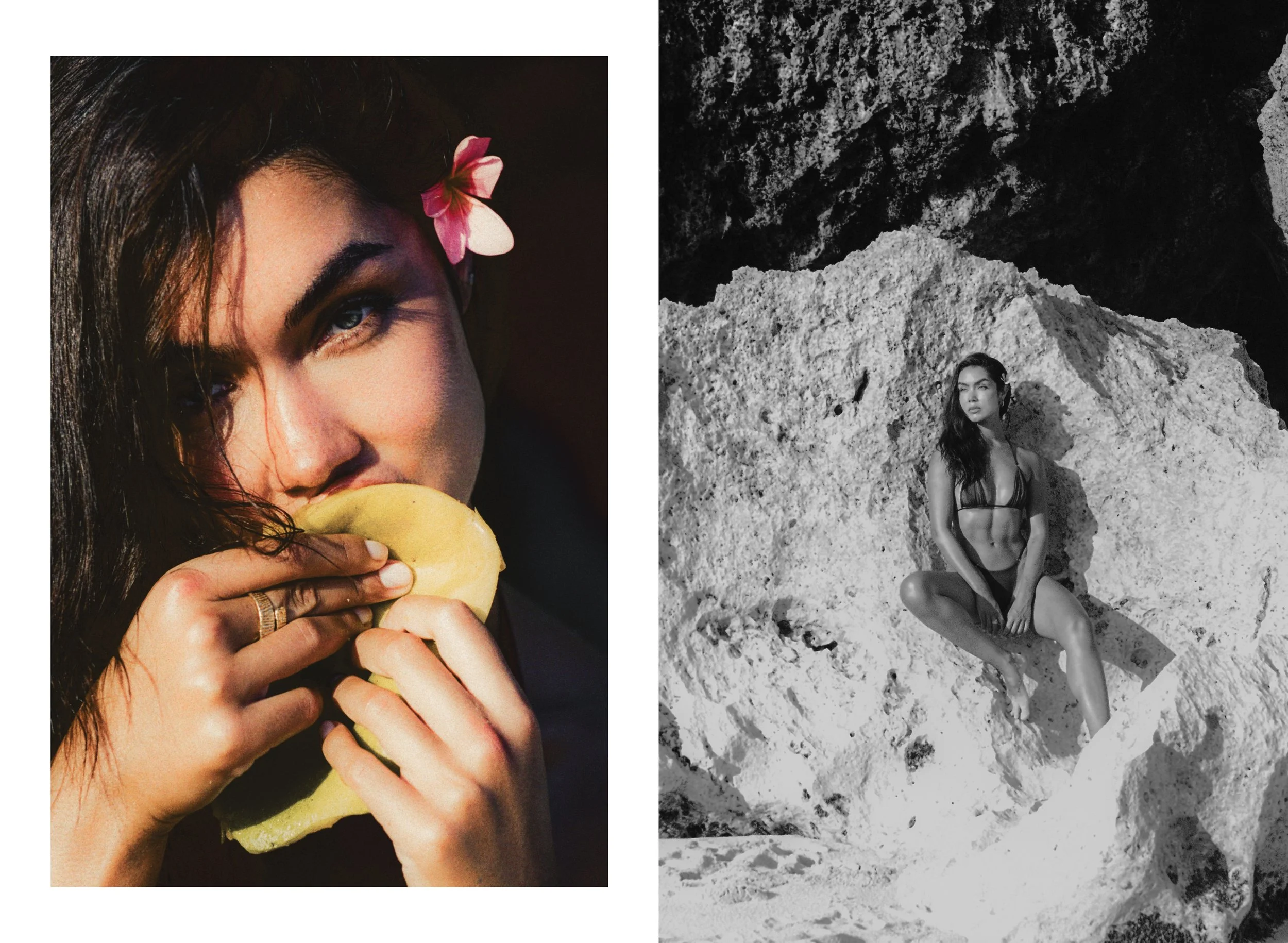 Side-by-side photos of women, one in color with dark hair and a pink flower in hair eating a yellow melon, and the other in black and white in a bikini sitting on white rocks near the ocean.