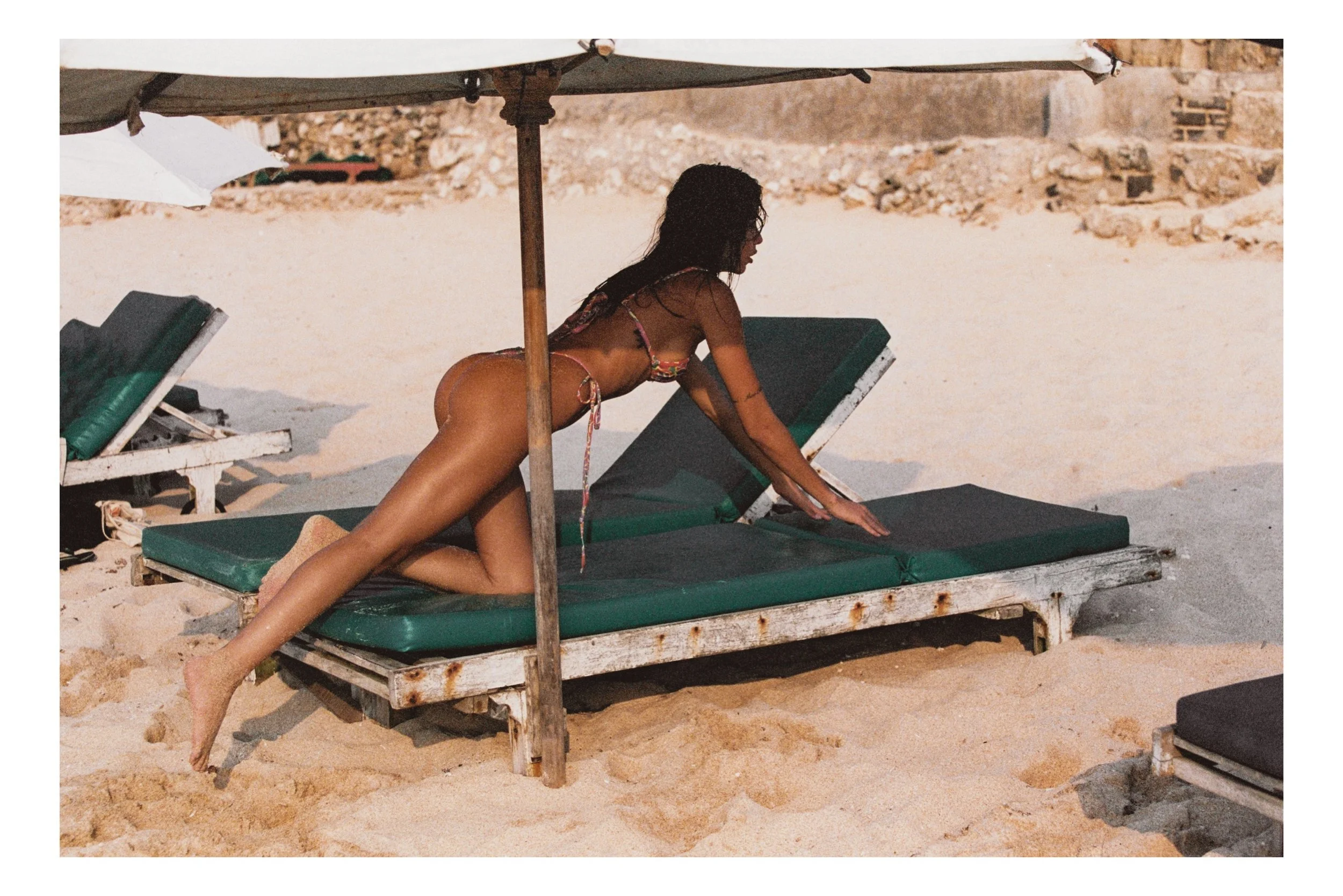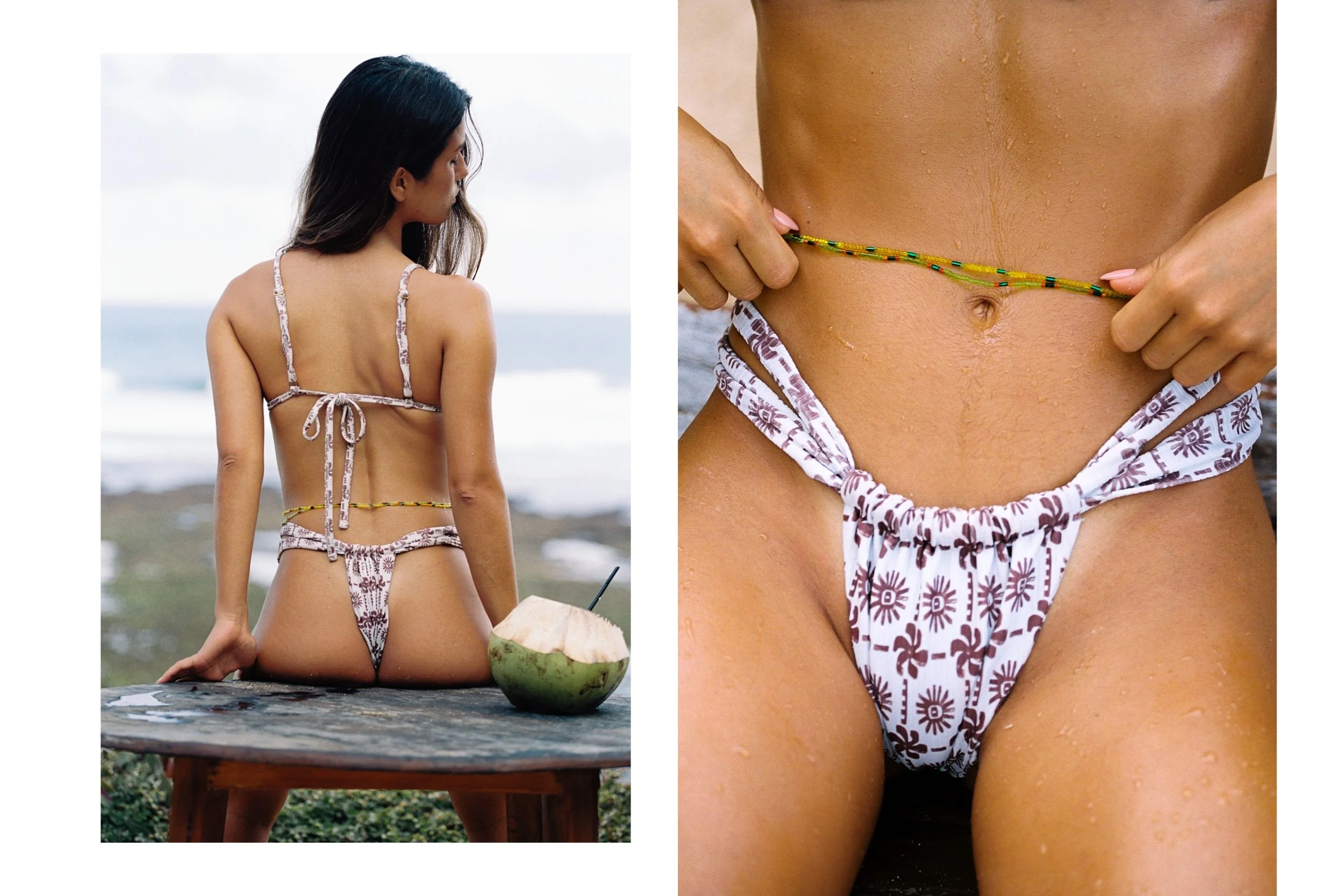 A woman wearing a patterned bikini, sitting outdoors with the ocean in the background, next to a coconut with a straw. The next close-up shows her waist with hands holding a beaded waist chain, and part of her patterned bikini bottom.