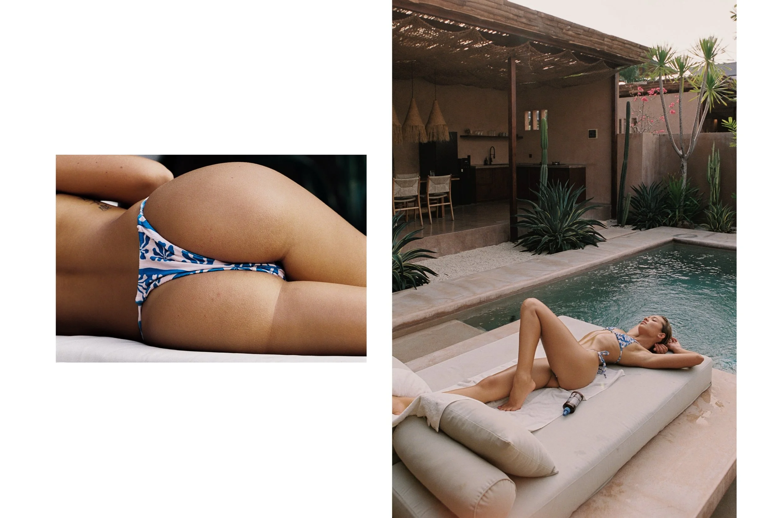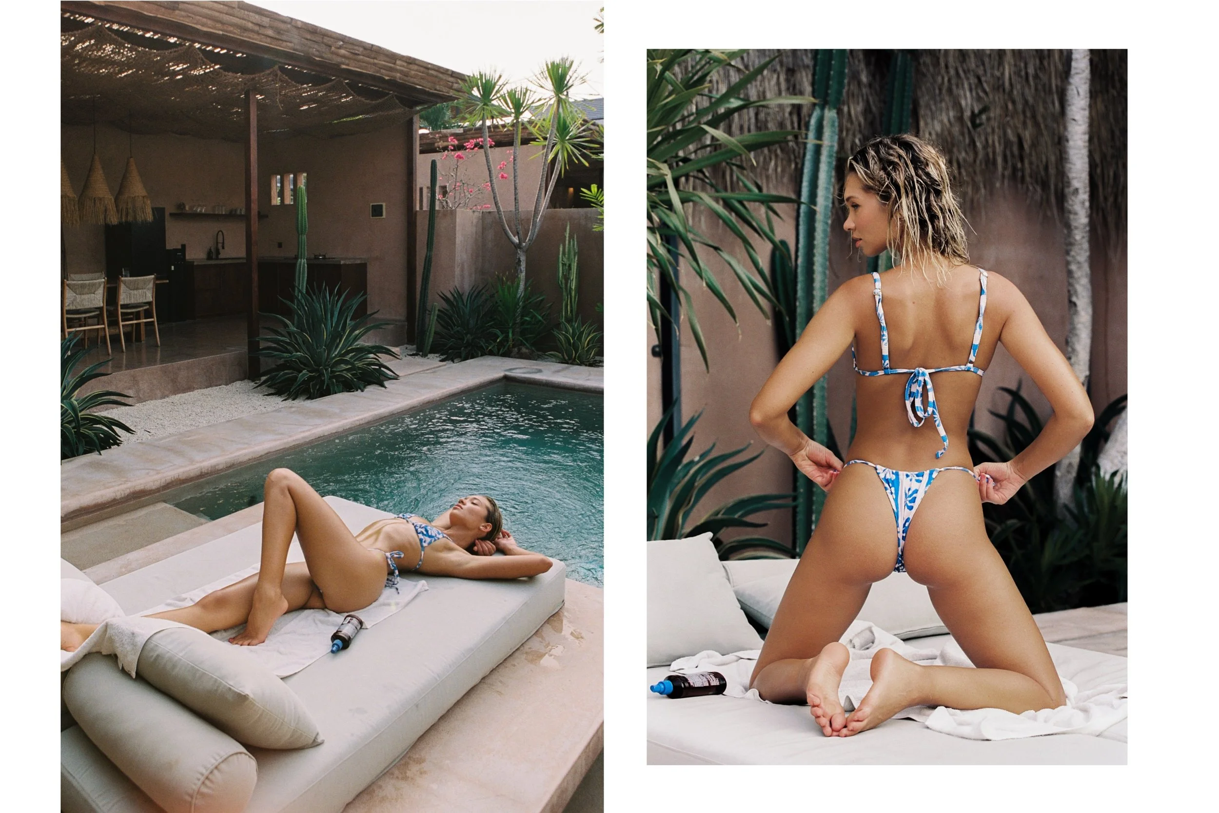 Two images of a woman in a blue and white patterned bikini, one kneeling outdoors with her back facing the camera, and the other reclining indoors with her eyes closed and head tilted back.