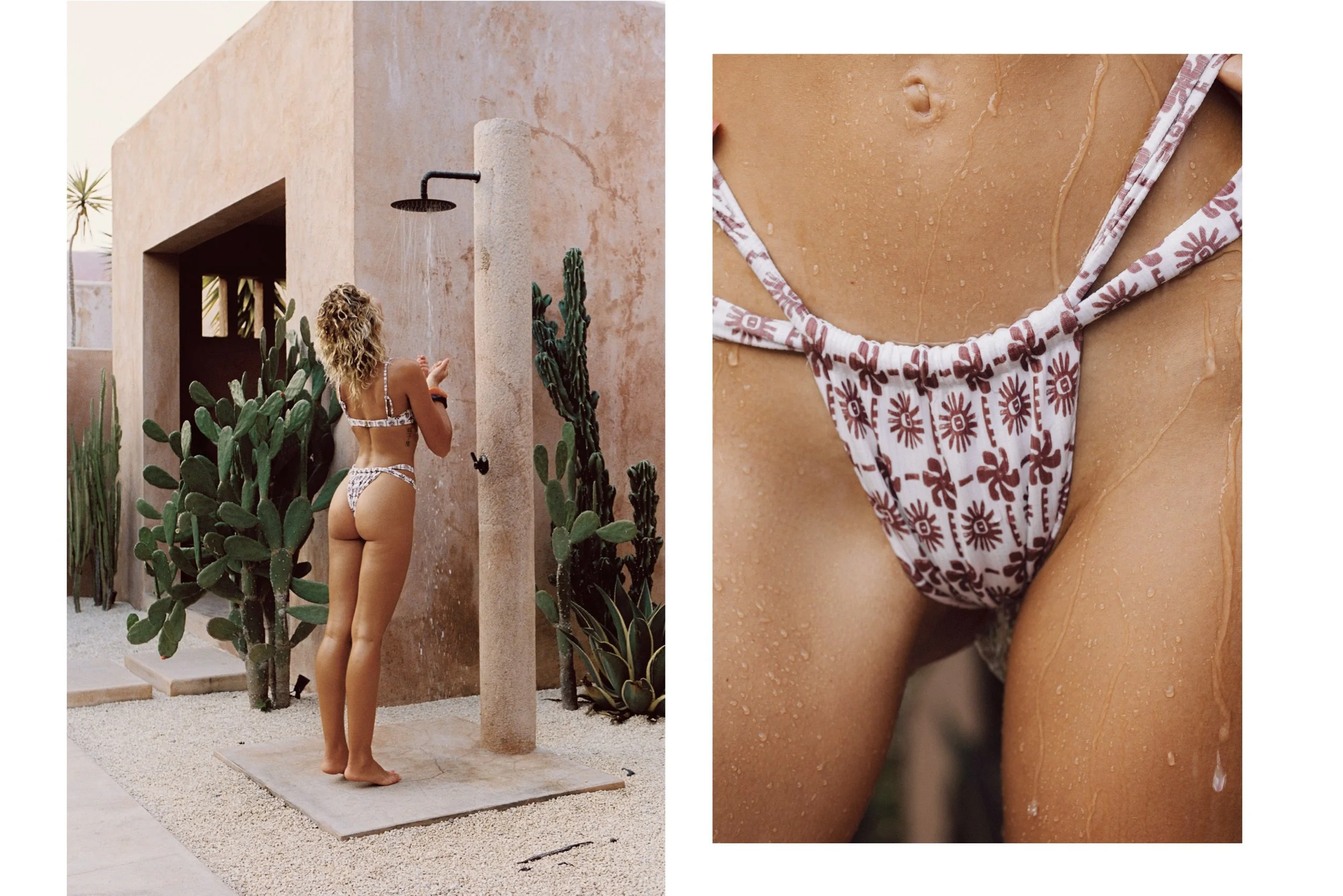 A woman in a patterned bikini showering outdoors near a cactus plant and a beige stucco building, with a close-up of her bikini bottom and water droplets on her skin.