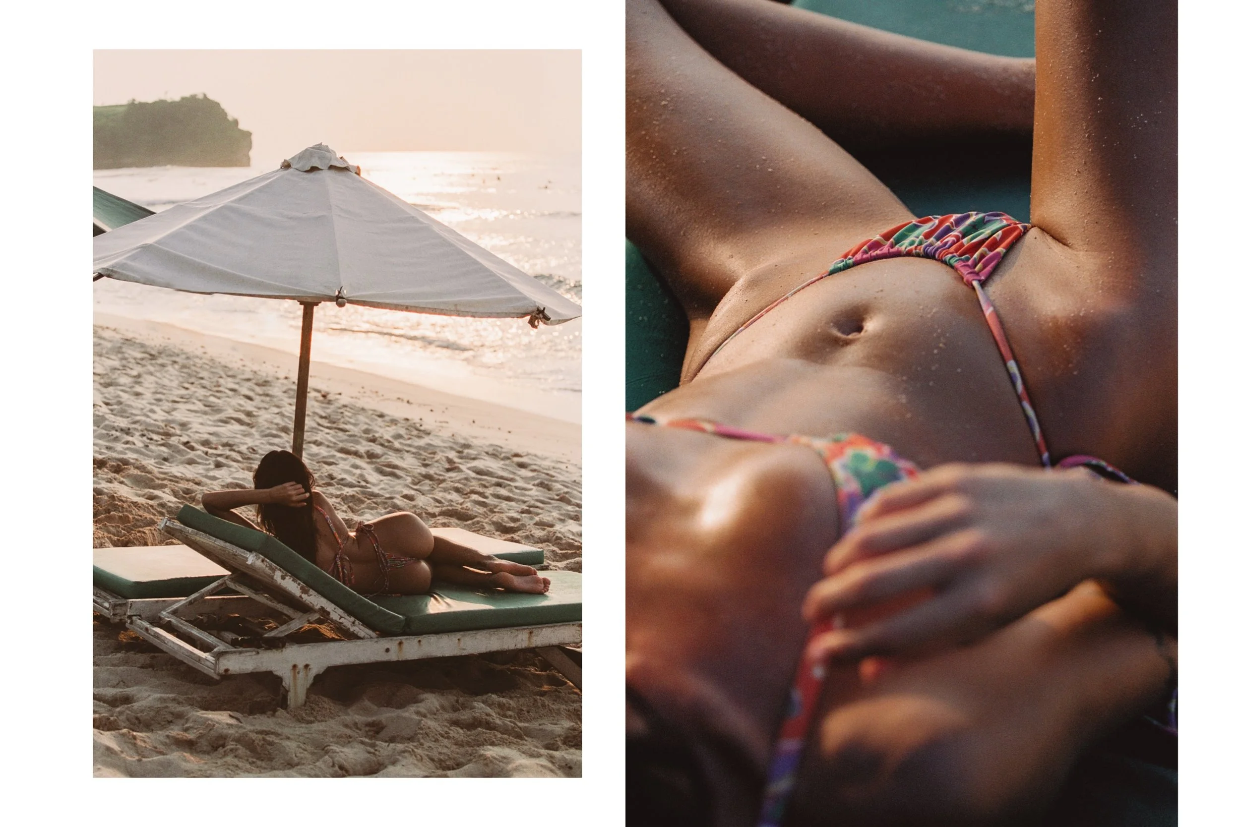 A woman relaxing on a lounge chair under an umbrella on the beach during sunset; close-up of her midsection in a colorful bikini, showcasing the sun's glow on her skin.