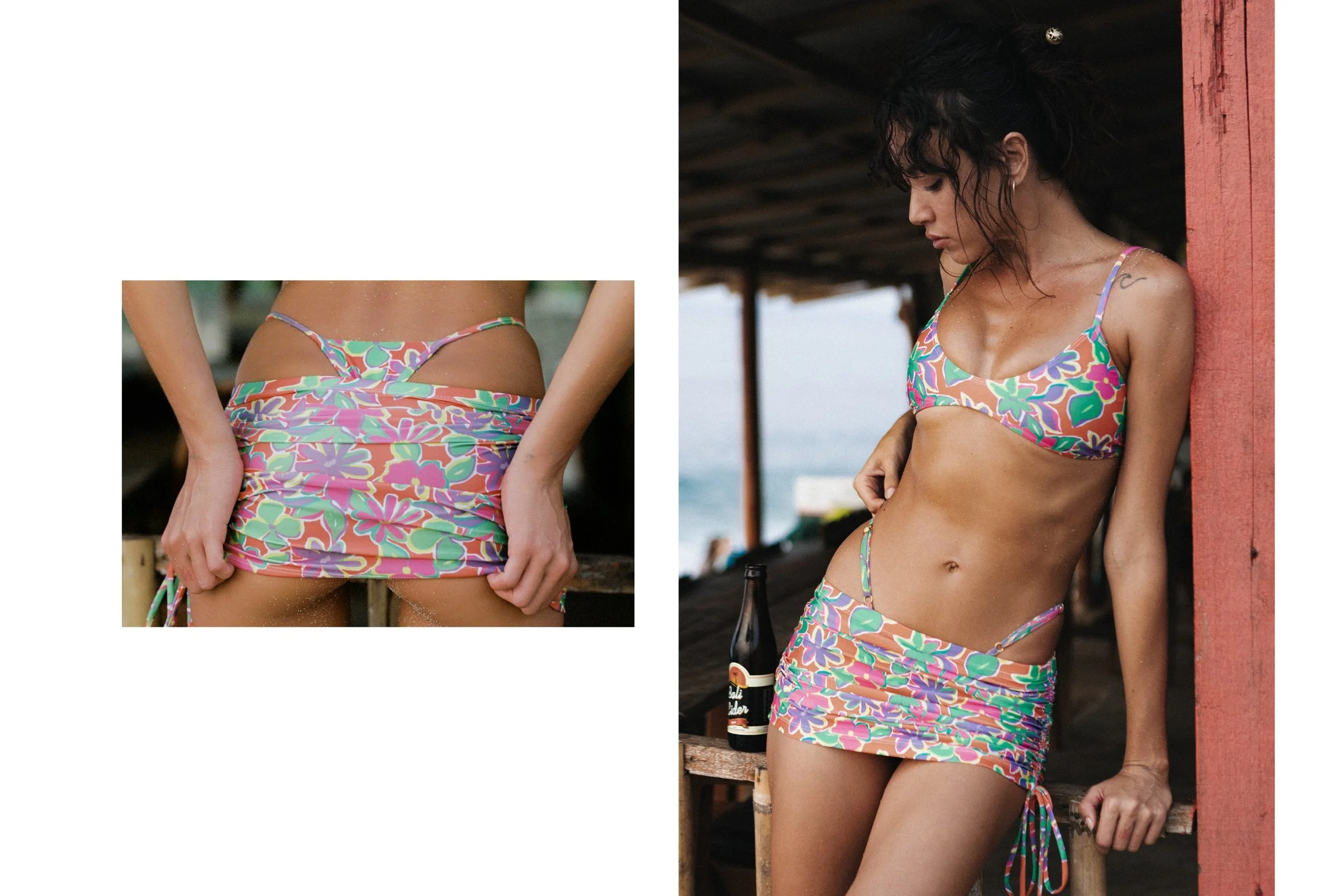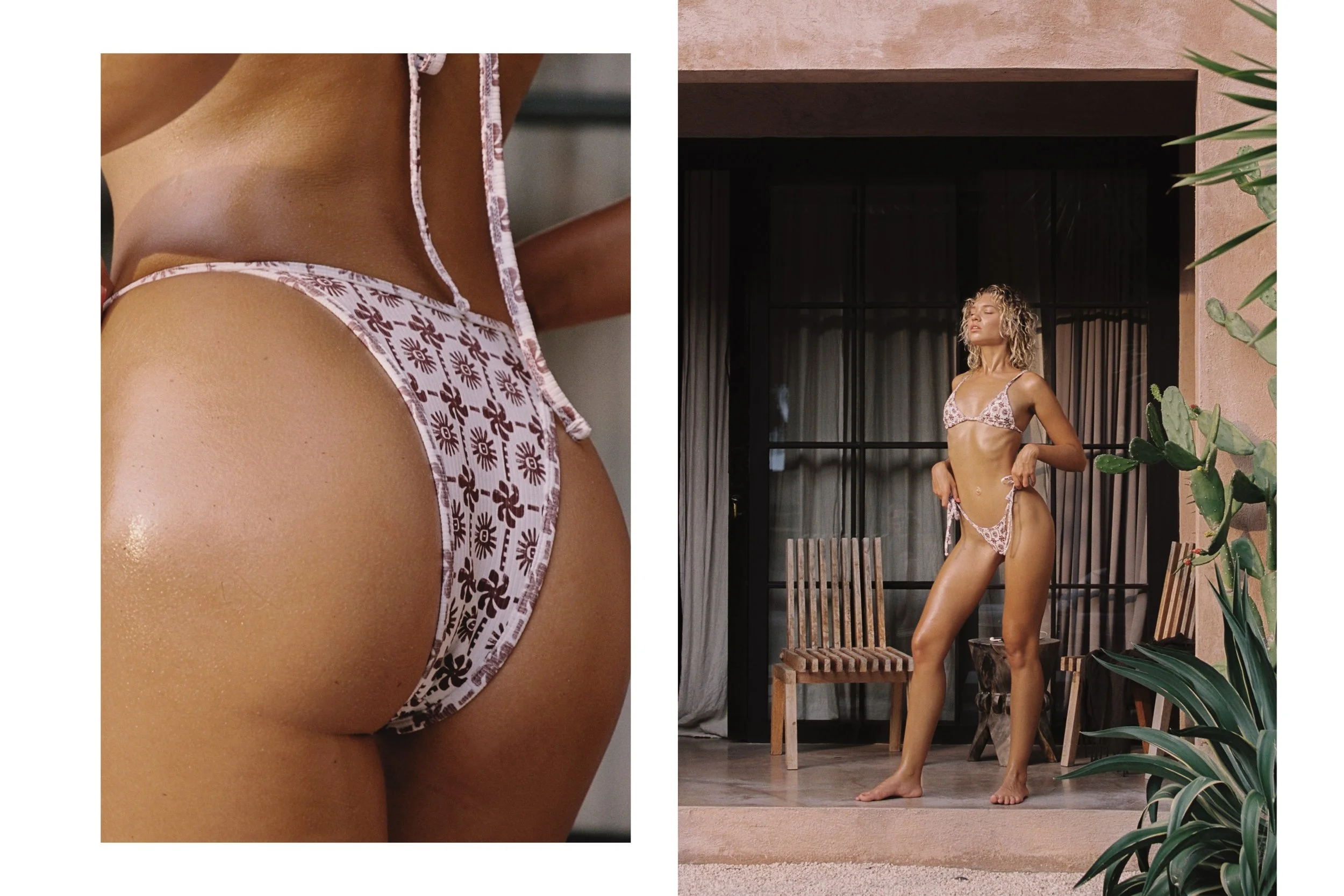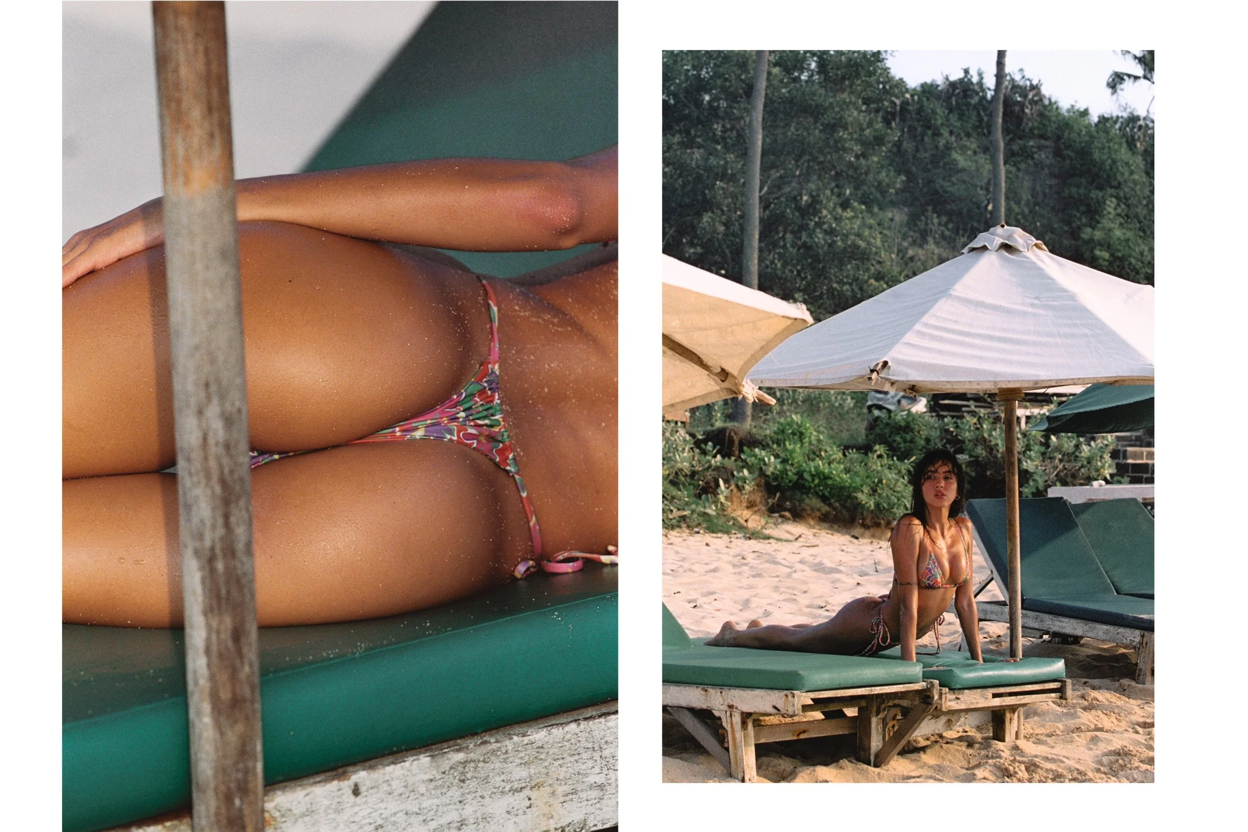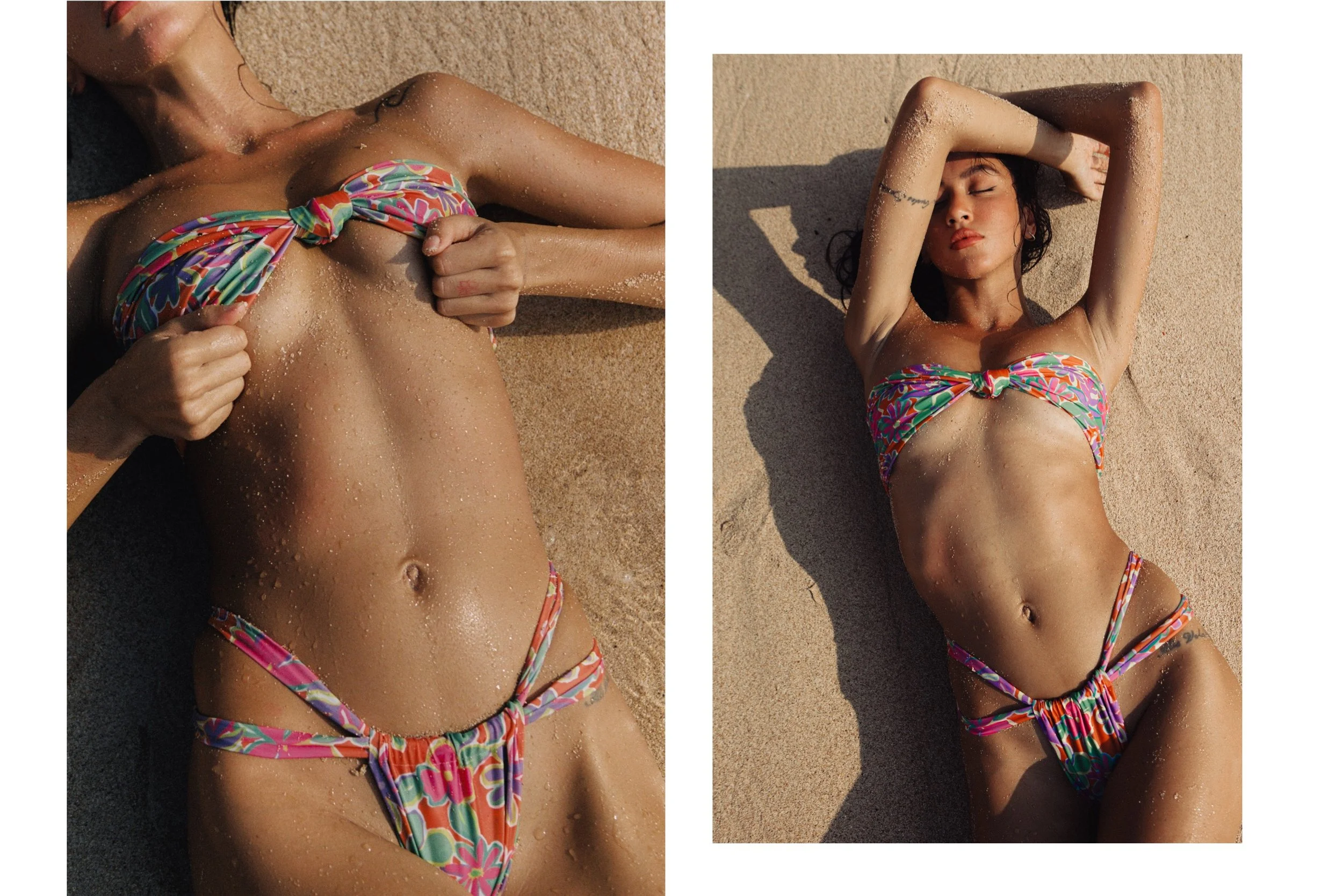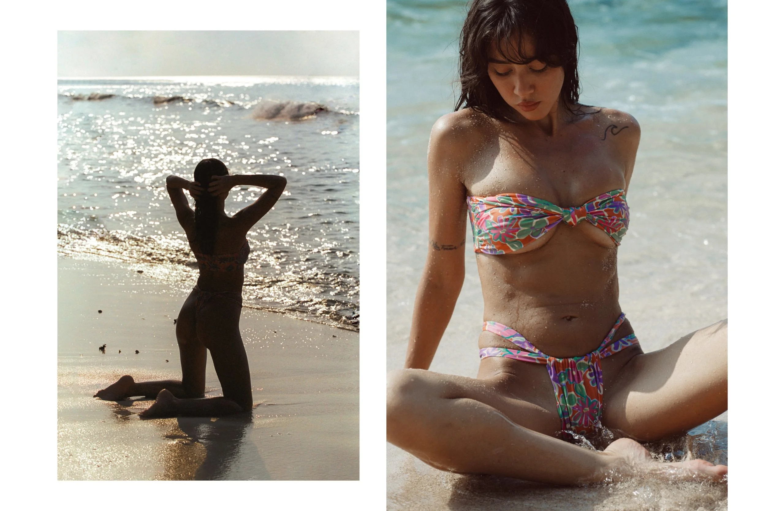 A woman in a floral bikini sitting outdoors near a bamboo structure, with close-up detail of her bikini featuring a red flower and a view of her side and hand.