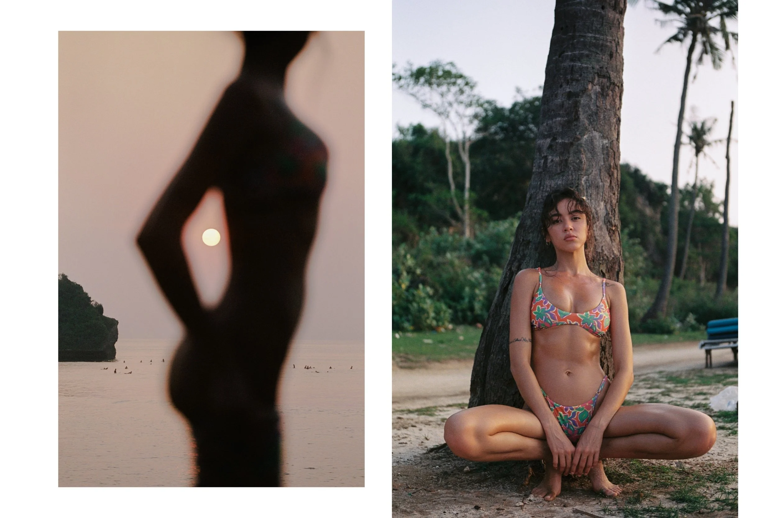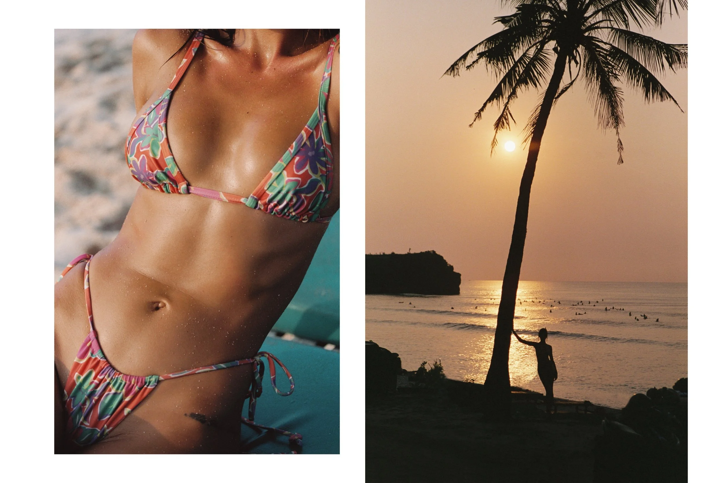 A woman in a colorful bikini with water droplets on her skin on the left, and a silhouette of a woman holding hands with a palm tree on the right, both scenes set at a beach during sunset.