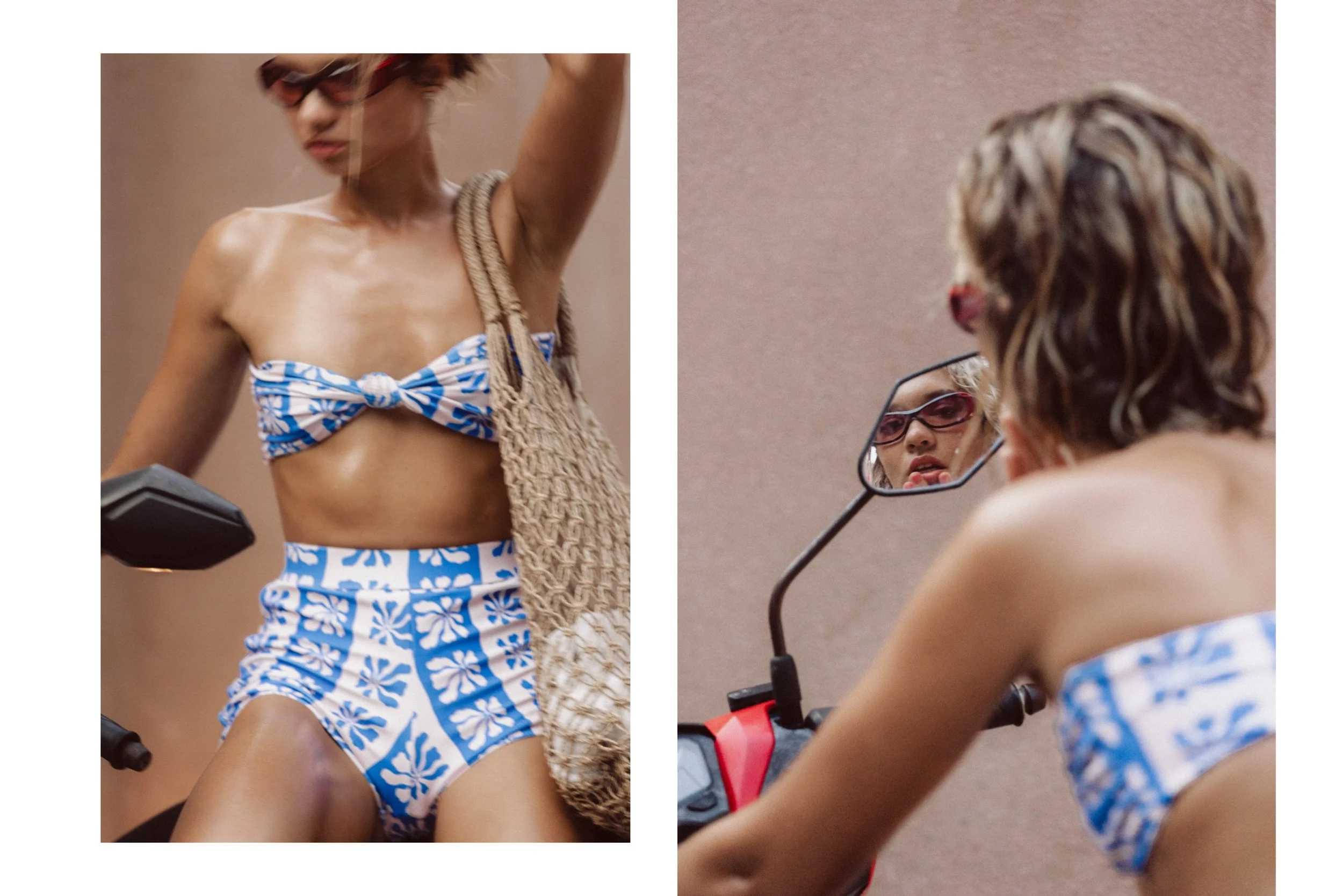 A woman in a blue and white floral patterned strapless top and high-waisted shorts, sitting on a motorcycle, with close-up of her midsection showing the matching top and shorts.