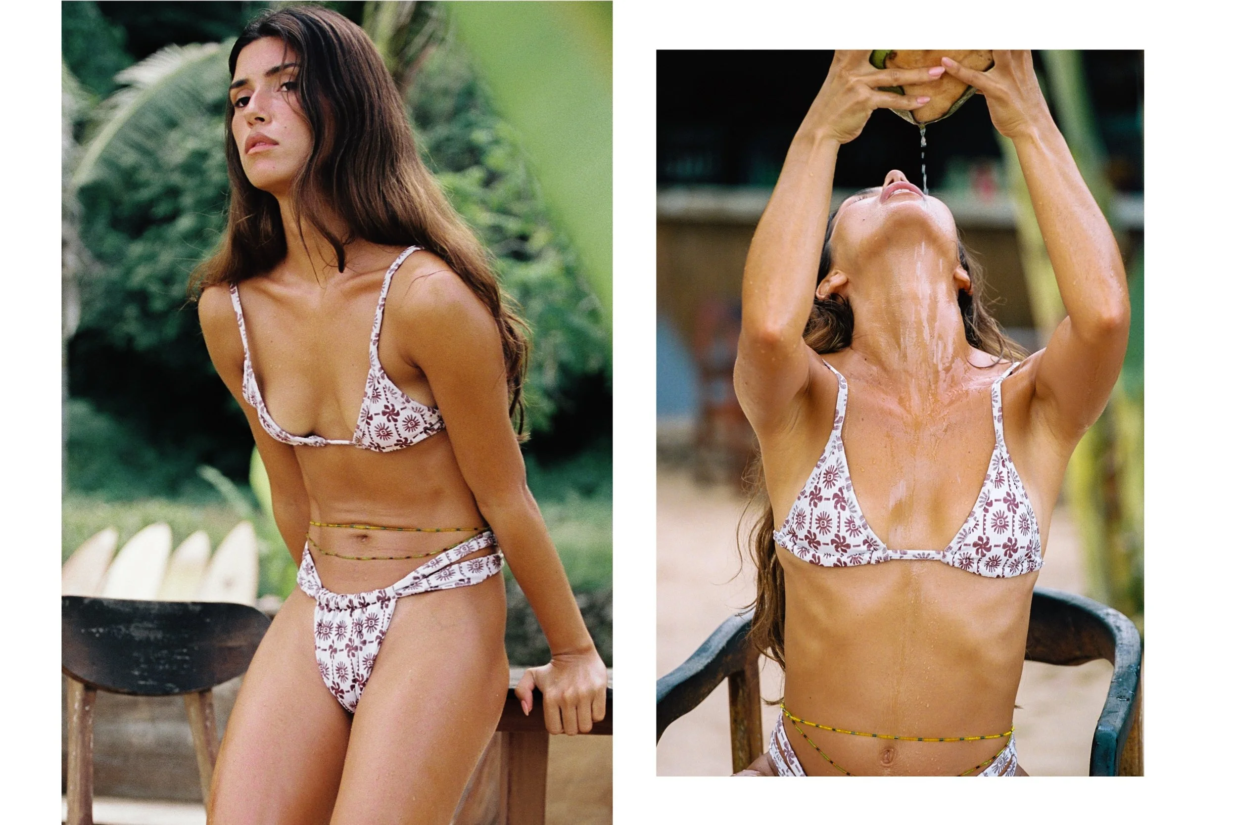 Two photographs of a young woman in a matching bikini with a floral pattern. In the first photo, she is sitting on a wooden chair, holding her bikini straps, with a relaxed expression, against a neutral background. In the second photo, she is standin