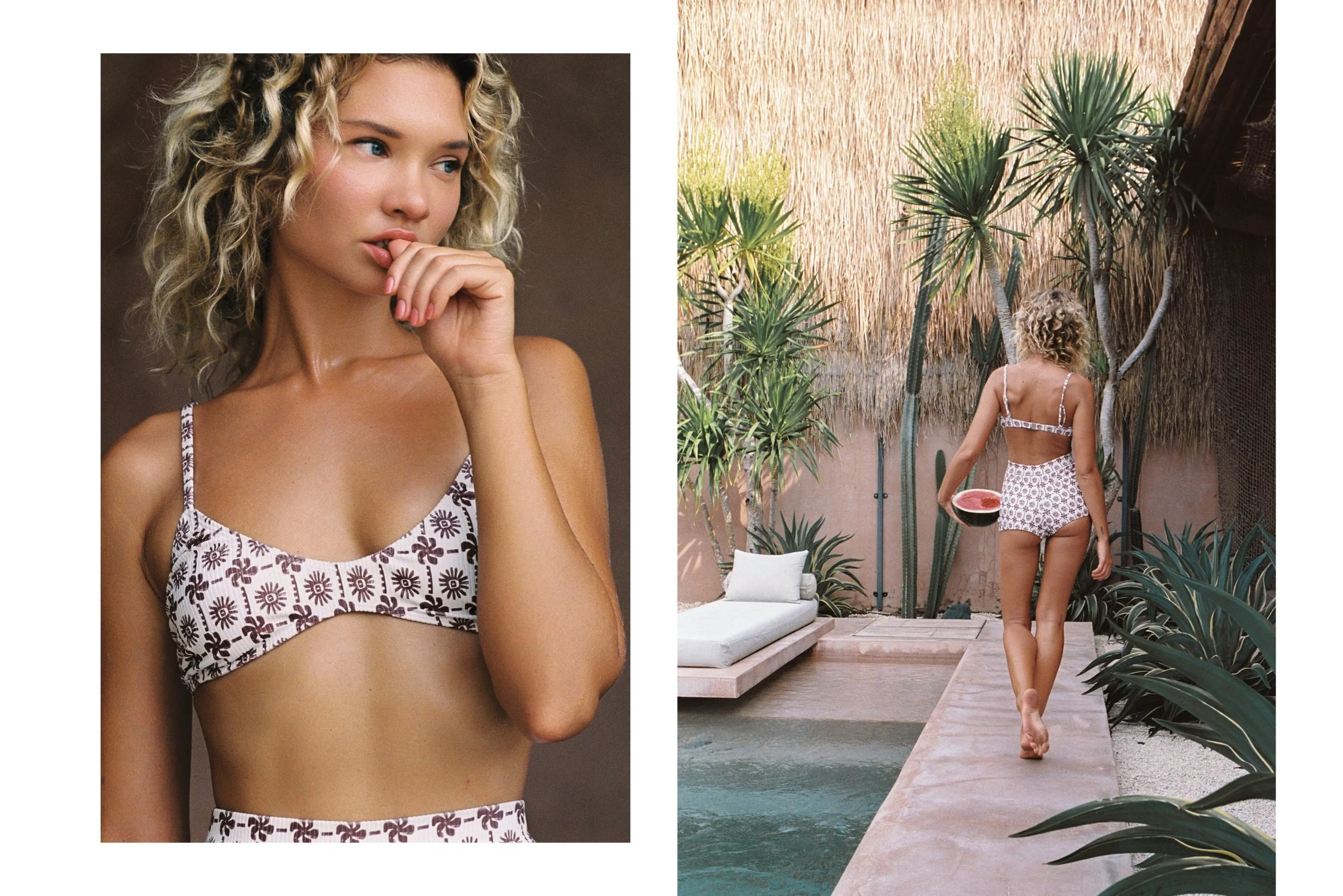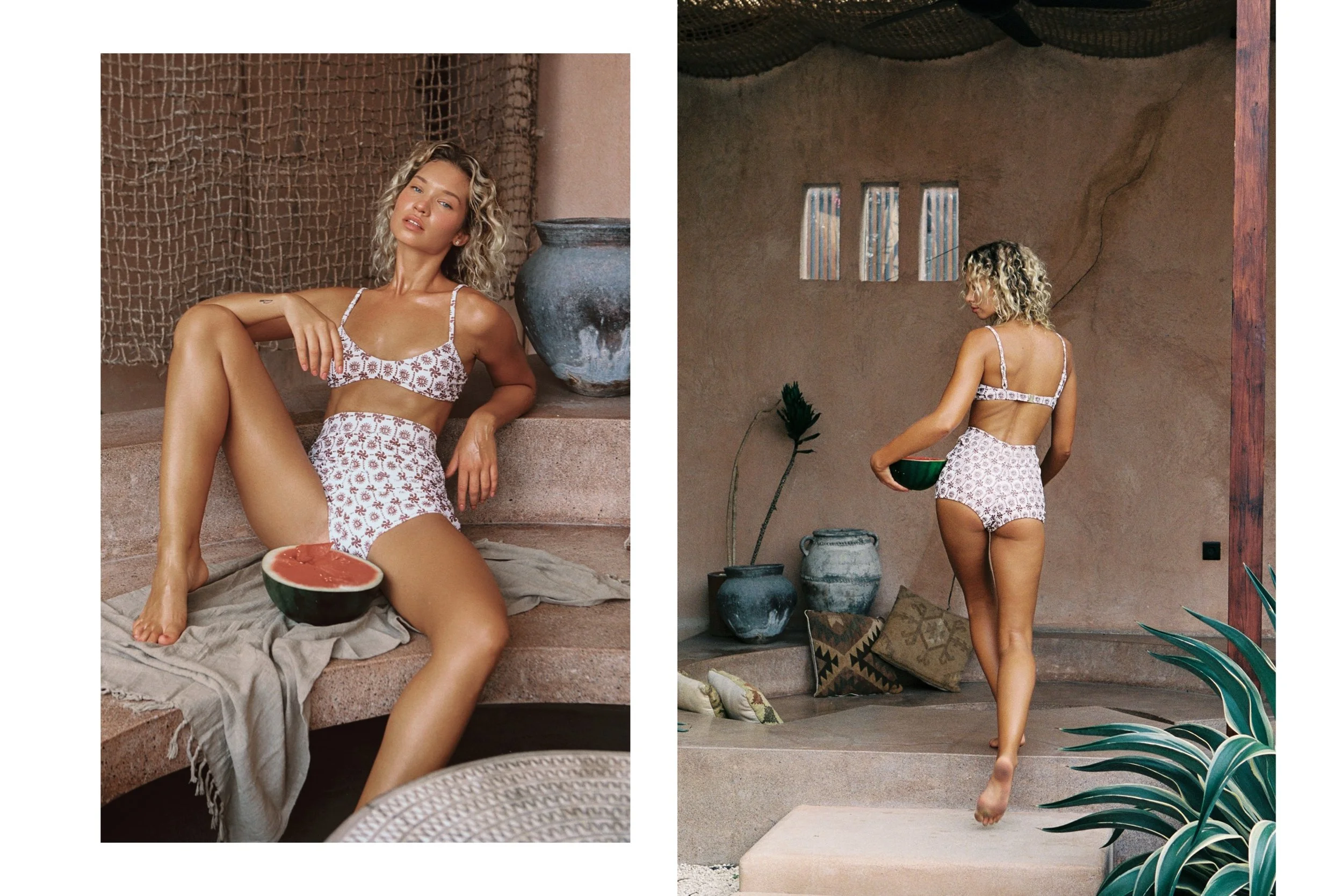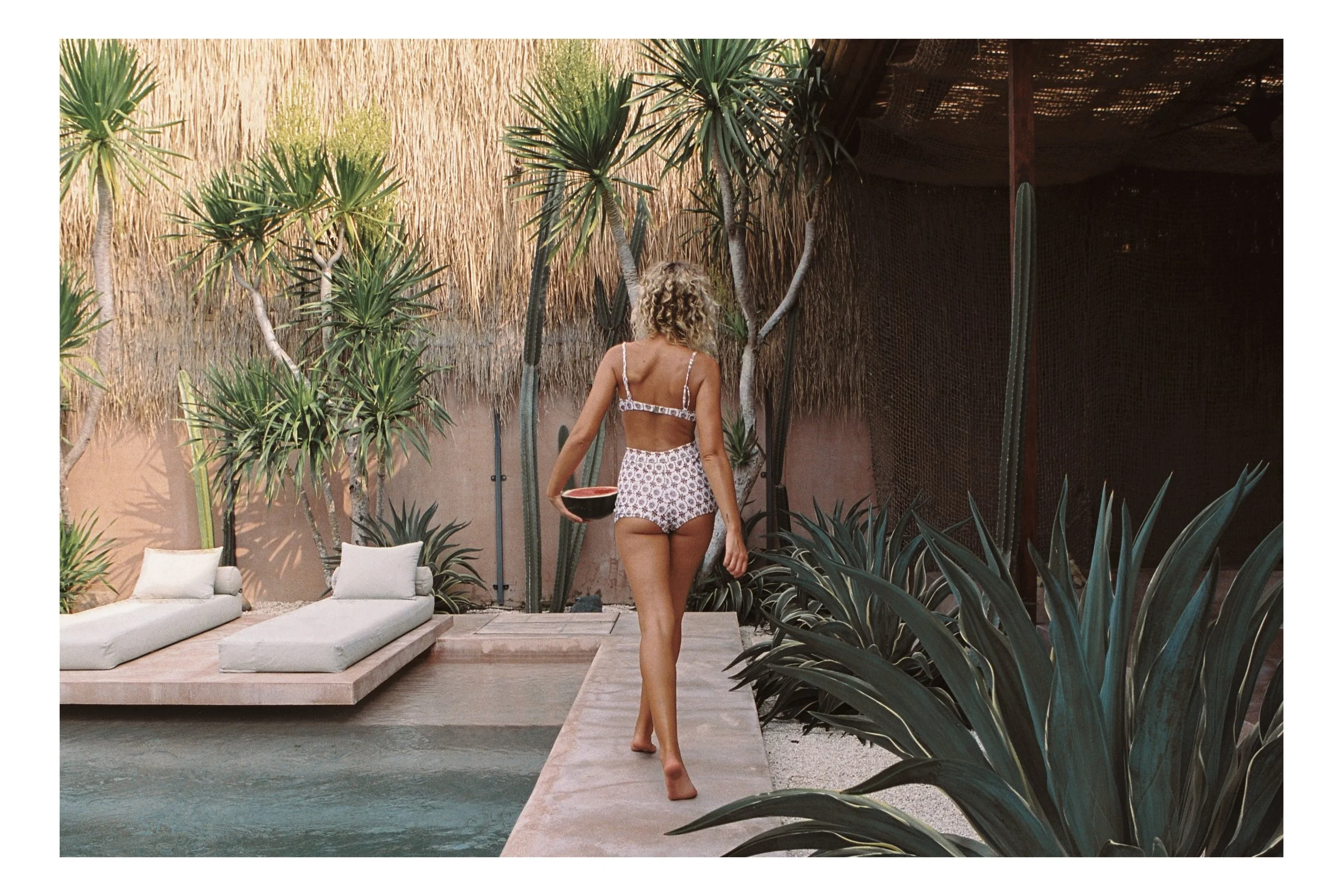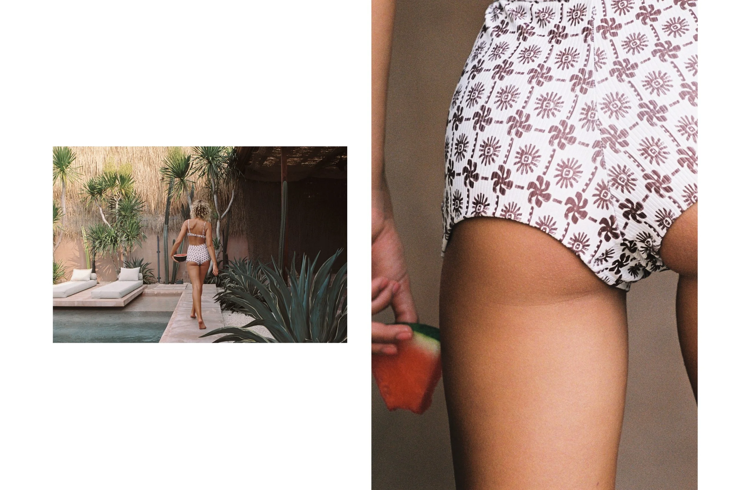 A woman with curly blonde hair wearing a two-piece swimsuit with a red and white pattern, sitting on a stone step holding a half watermelon, and in the second image, she is standing with her back turned, holding a bowl, in a rustic, earthy-toned indo