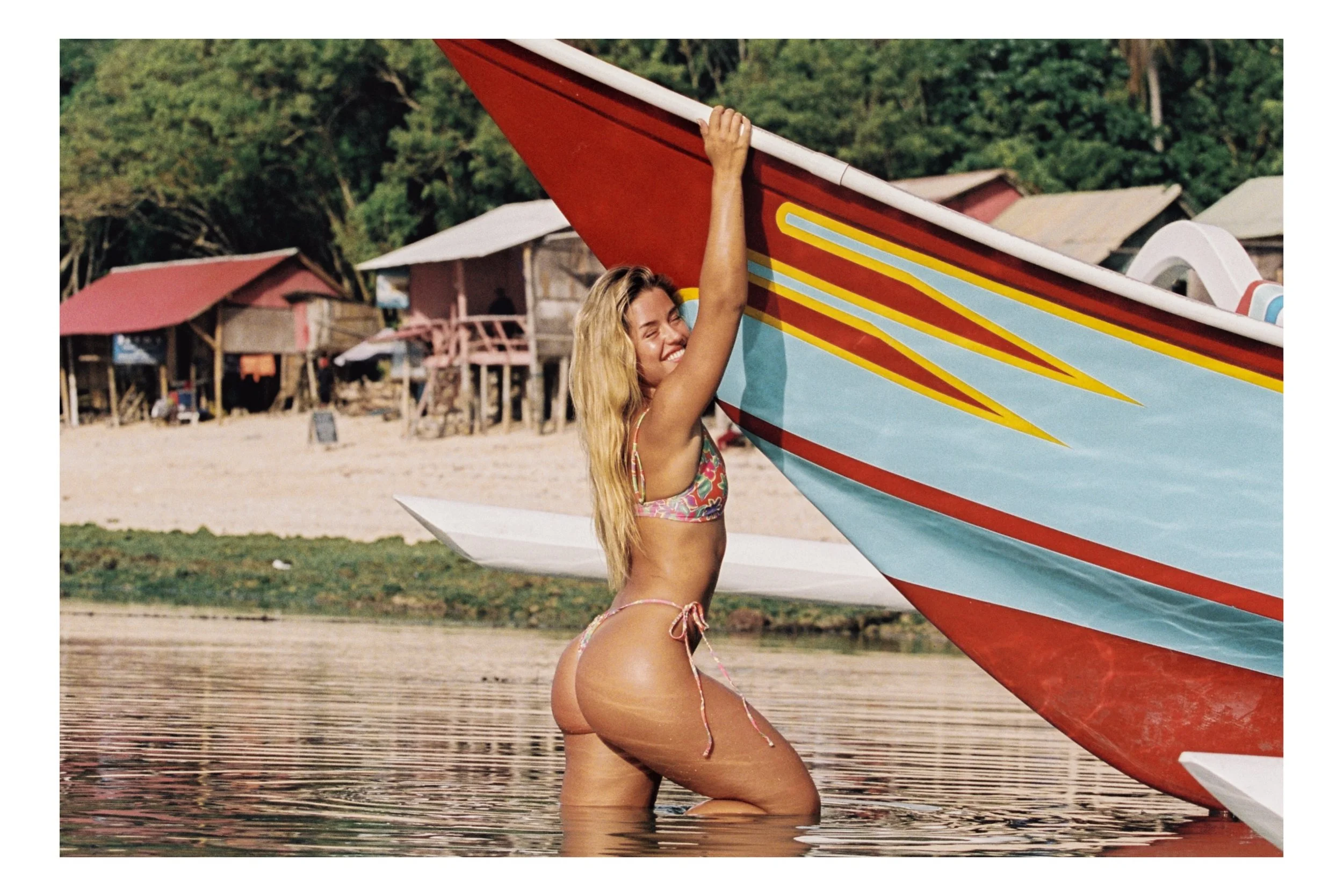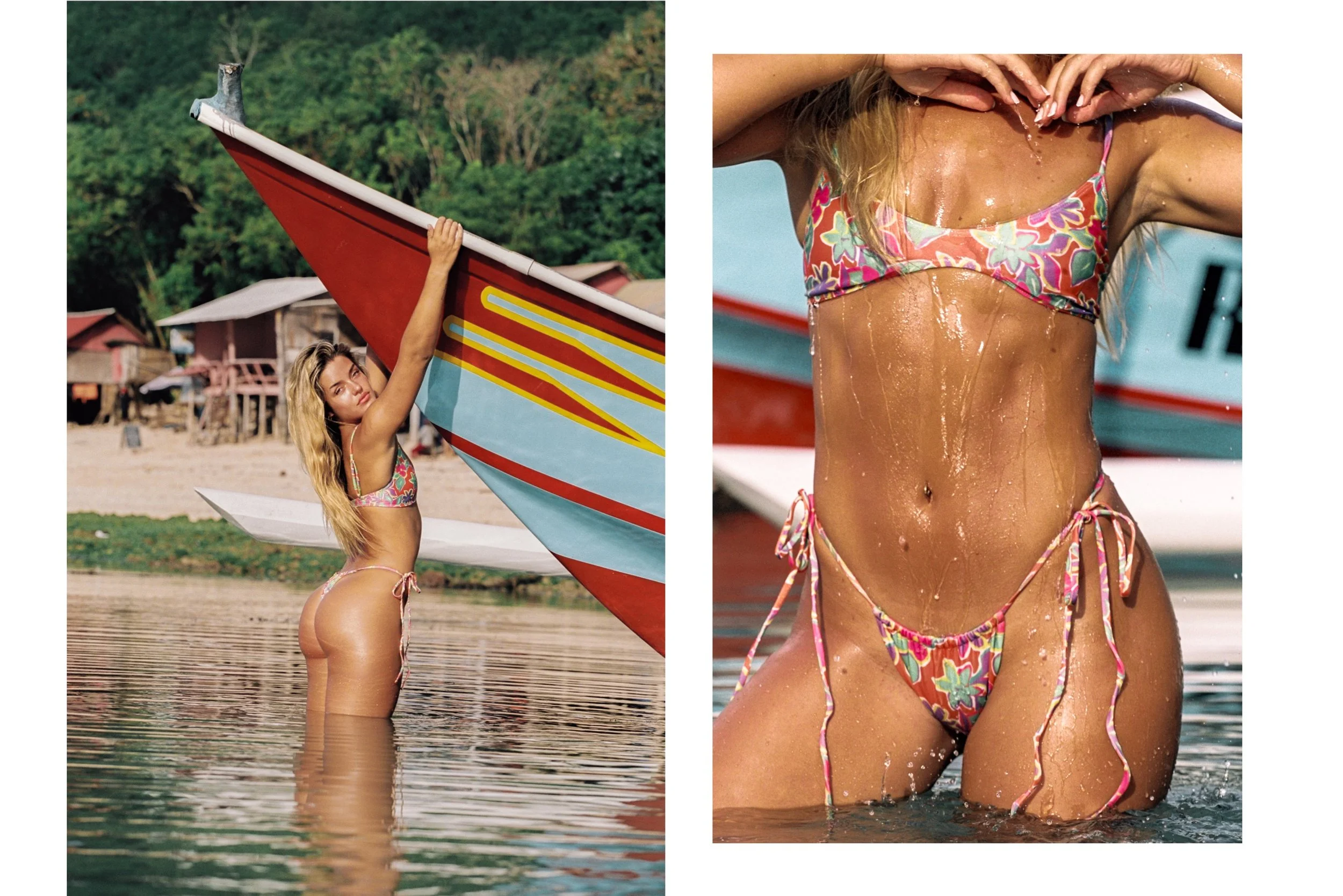 A woman in a colorful bikini standing in water at a beach, holding a boat above her head. In a close-up, her torso is wet and she is wearing the same bikini, with her hands behind her head, standing in the water near a boat.