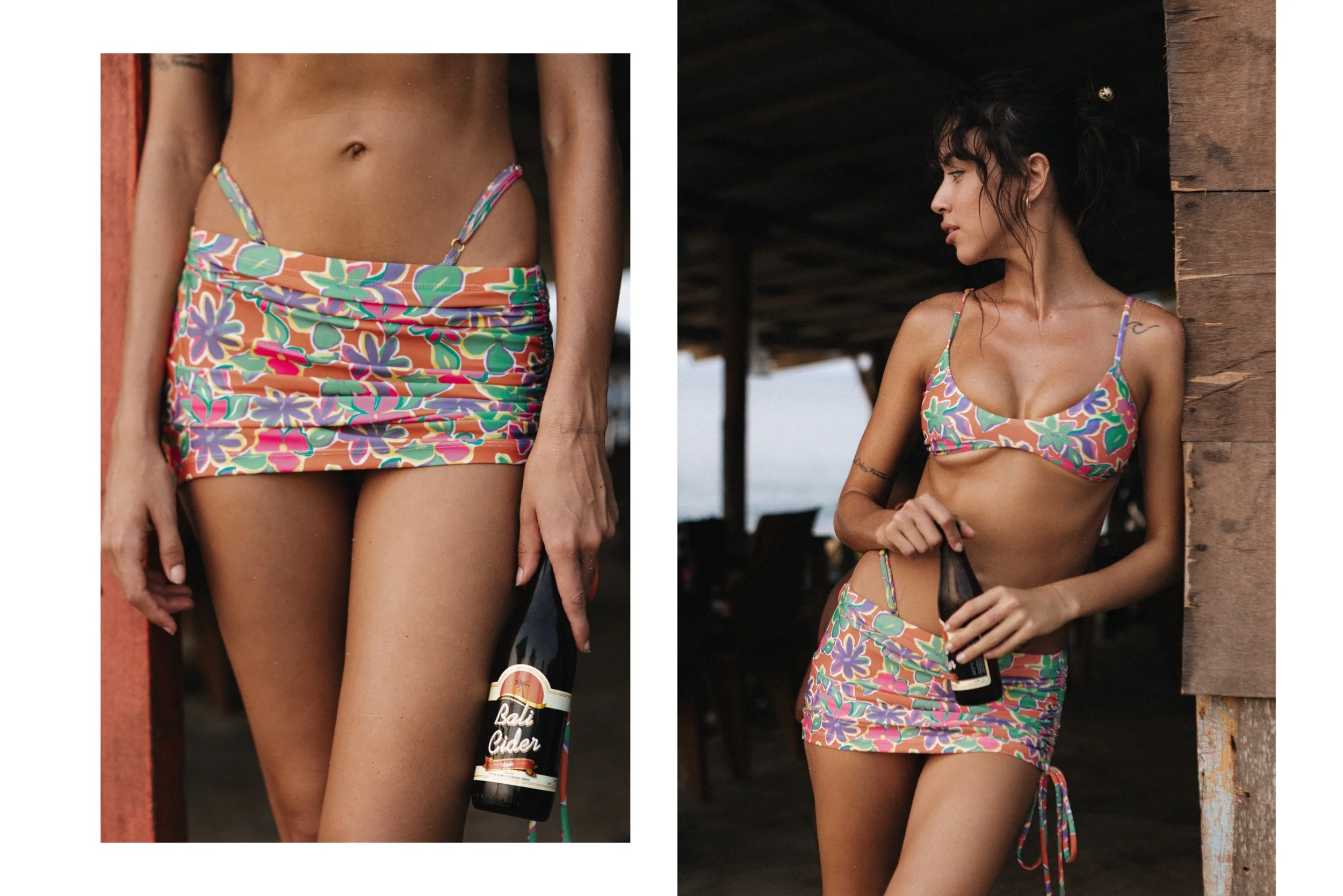 A woman wearing a colorful, floral-patterned bikini and skirt holding a bottle of bottle cider in a tropical setting.
