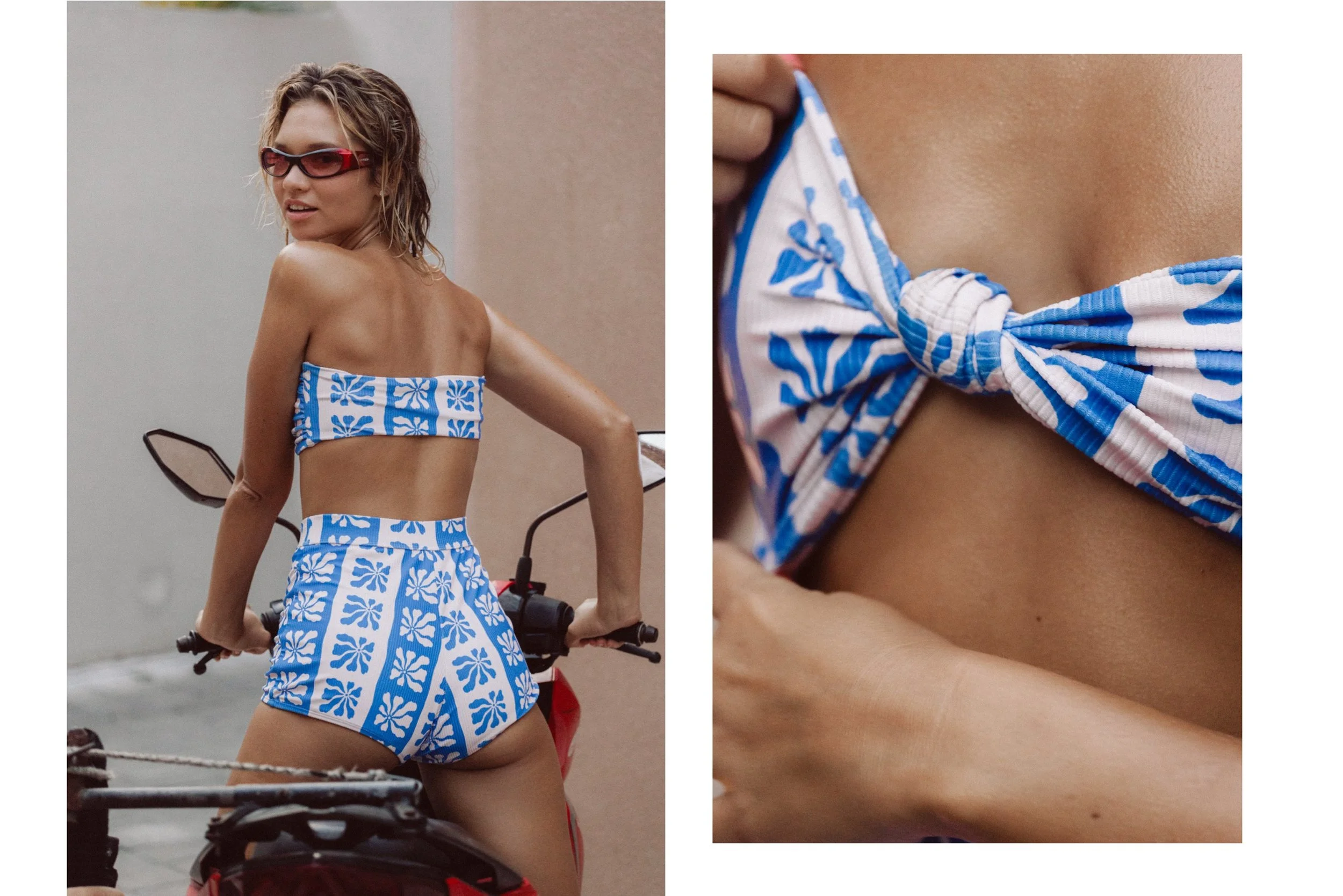 A woman wearing a blue and white patterned bandeau top and matching high-waisted shorts, posing with a motorcycle outdoors. The image is split: the left side shows her full outfit and pose, while the right side is a close-up of the top with a knot de
