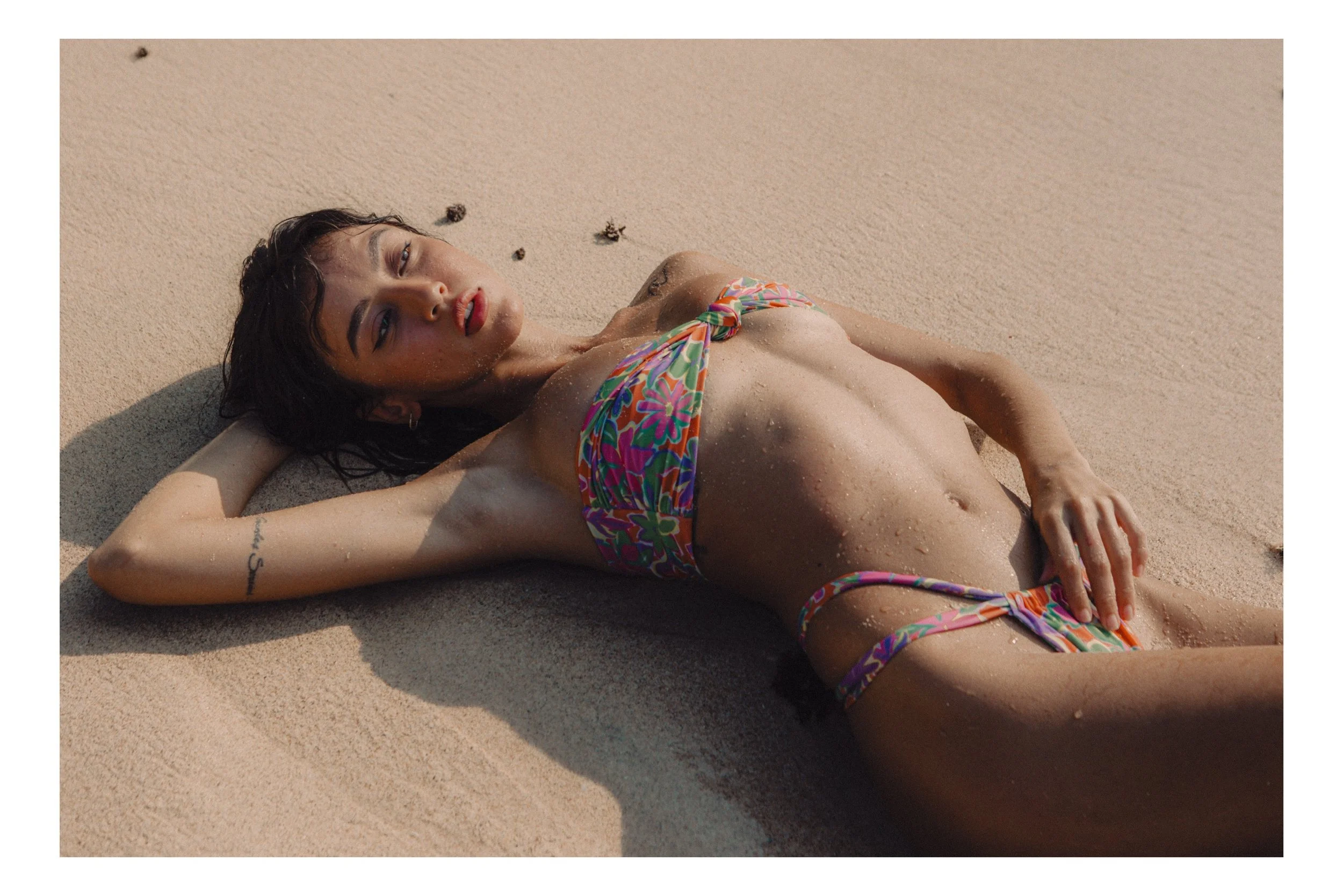 Woman lying on sandy beach wearing a colorful bikini, with sand on her skin, her left arm behind her head, and her right hand resting on her stomach. She has dark hair, makeup, and a tattoo on her left forearm.