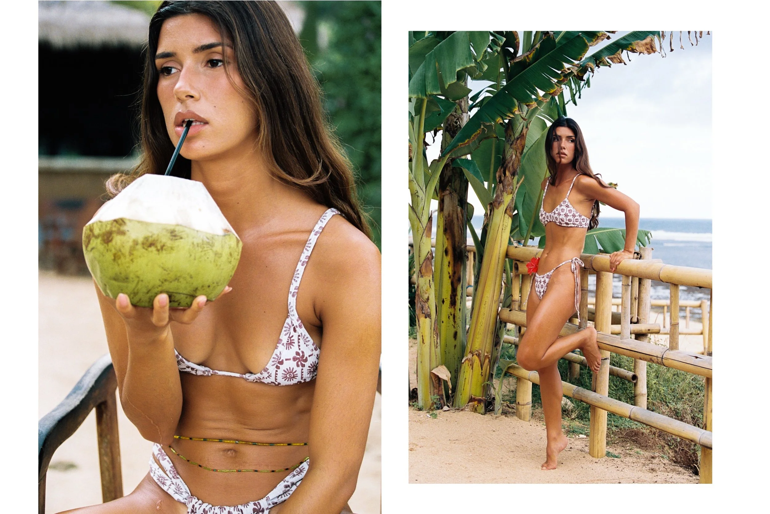 A woman in a bikini on a beach, one photo shows her sipping a coconut drink, the other shows her standing by a bamboo fence with a backdrop of tropical trees and the ocean.