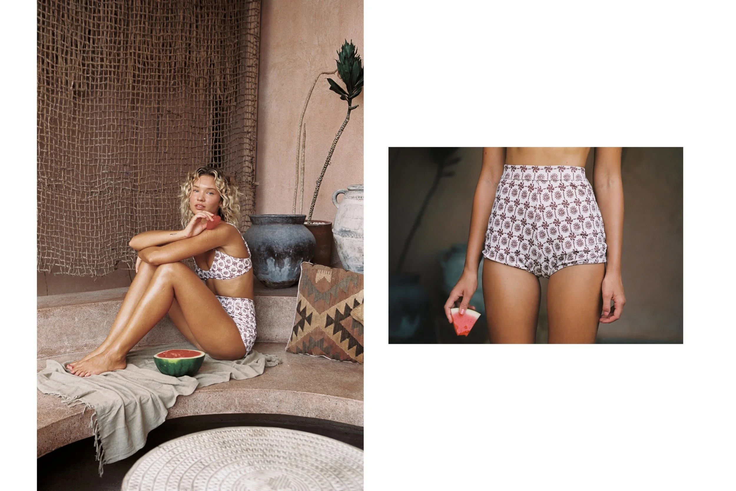 Woman sitting on a beige blanket with watermelon slices, wearing matching prints bikini and shorts, inside a room with plant, vases, and textured wall; close-up of woman's high-waisted shorts with watermelon print, against a blurred background.