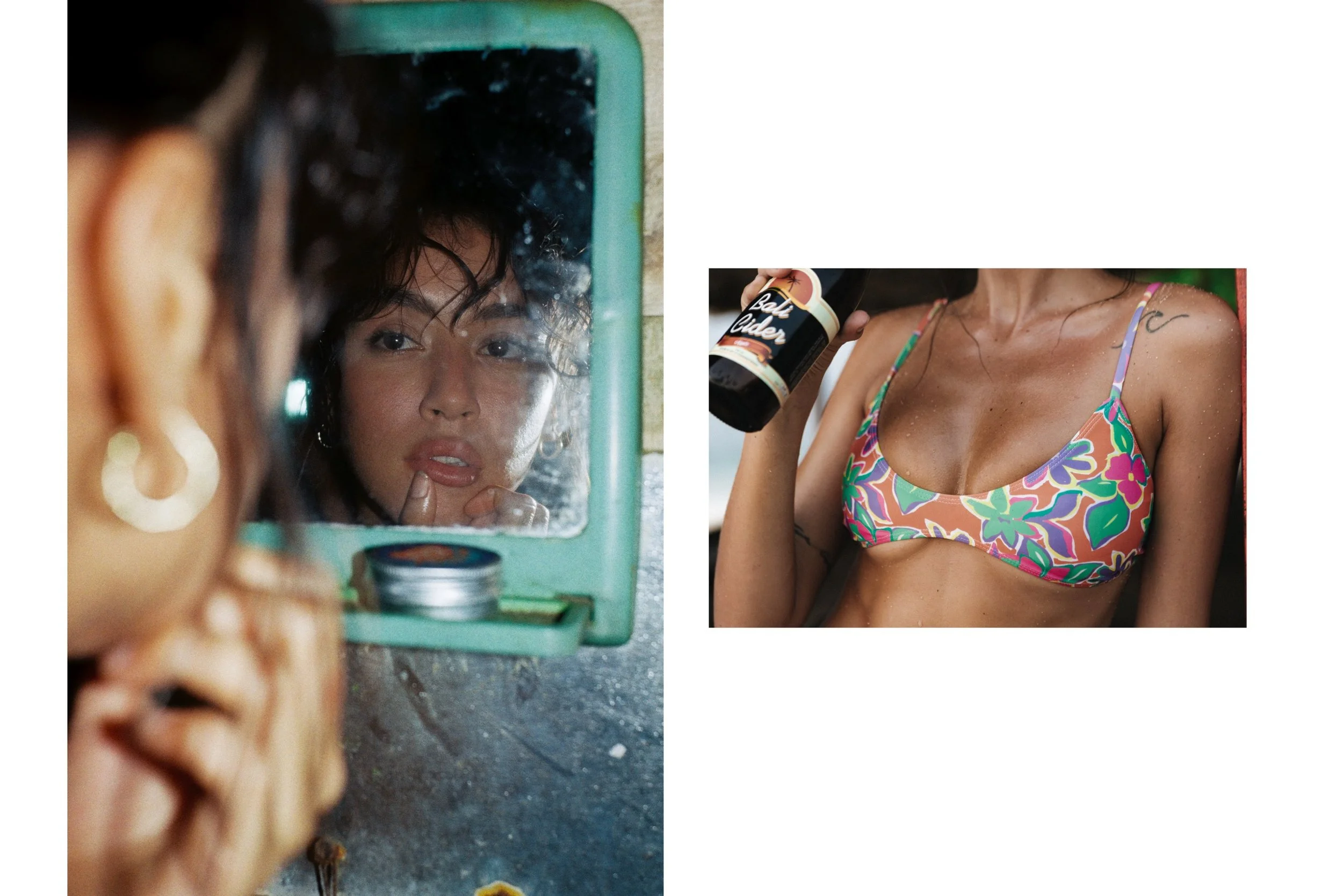 A woman with curly hair and hoop earrings looking into a mirror, touching her lips, and another woman holding a bottle of apple cider in a colorful swimsuit with a floral pattern.