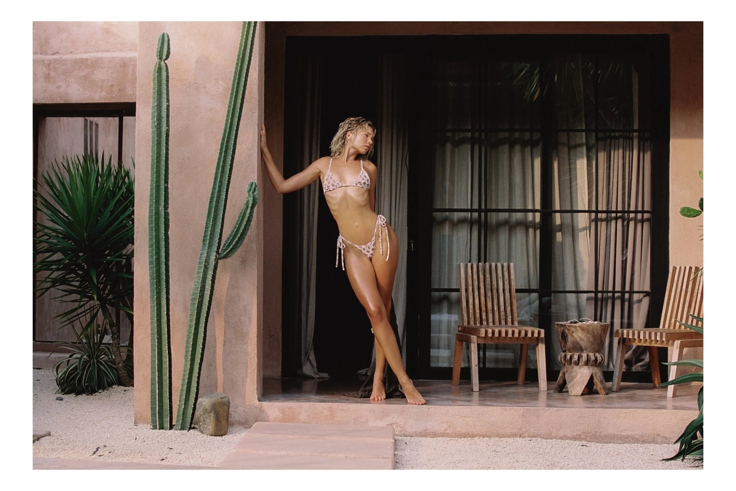 A woman in a pink patterned bikini standing in a doorway, leaning against the wall with one hand, surrounded by desert plants and outdoor furniture.