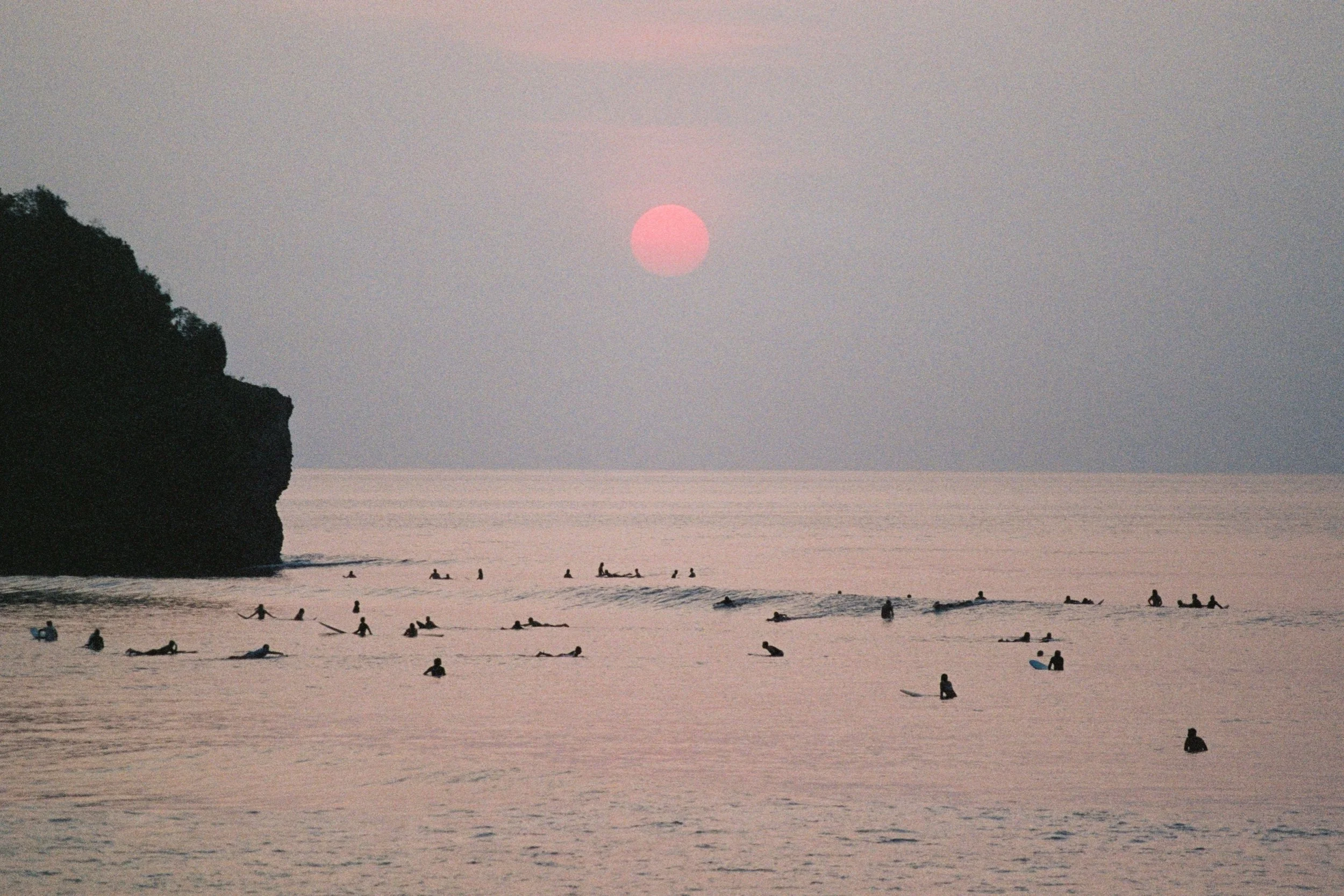 Surfers waiting in the ocean at sunset, near a rocky coastline with a pink sun in the sky.